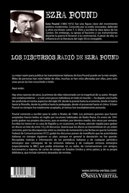 La mejor razón para publicar las transmisiones italianas de Ezra Pound puede ser la más simple. Miles de personas han oído hablar de ellas, muchas se han visto afectadas por ellas, pero solo unas pocas las han escuchado o leído. Aquí están. Hay otras razones de peso, la primera de ellas relacionada con la magnitud de su autor. Ningún otro estadounidense -y solo unos pocos individuos en todo el mundo- ha dejado una huella tan profunda en tantos aspectos del siglo XX: desde la poesía hasta la economía, desde el teatro hasta la filosofía, desde la política hasta la pedagogía, desde el provenzal hasta el chino.
