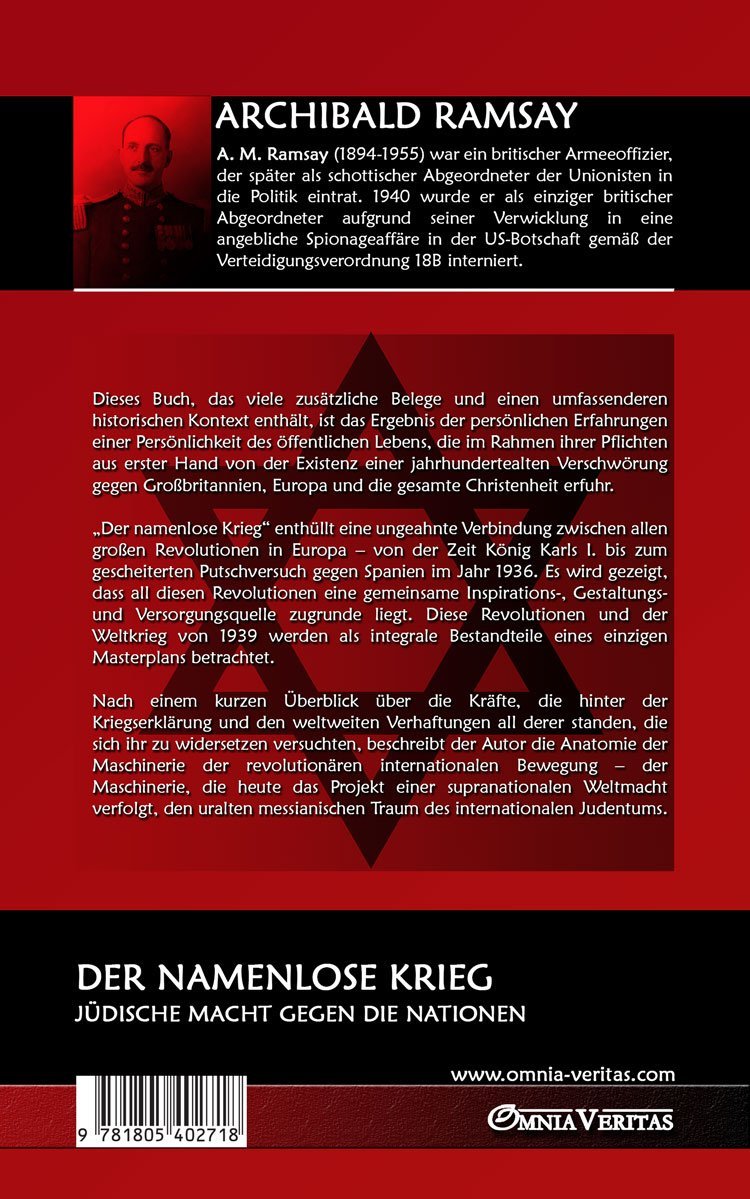 Der namenlose Krieg enthüllt eine ungeahnte Verbindung zwischen allen großen Revolutionen in Europa – von der Zeit König Karls I. bis zu dem gescheiterten Versuch gegen Spanien im Jahr 1936. Es wird gezeigt, dass all diesen Revolutionen eine gemeinsame Quelle der Inspiration, Konzeption und Versorgung zugrunde liegt. Diese Revolutionen und der Weltkrieg von 1939 werden als integrale Bestandteile ein und desselben Masterplans betrachtet.