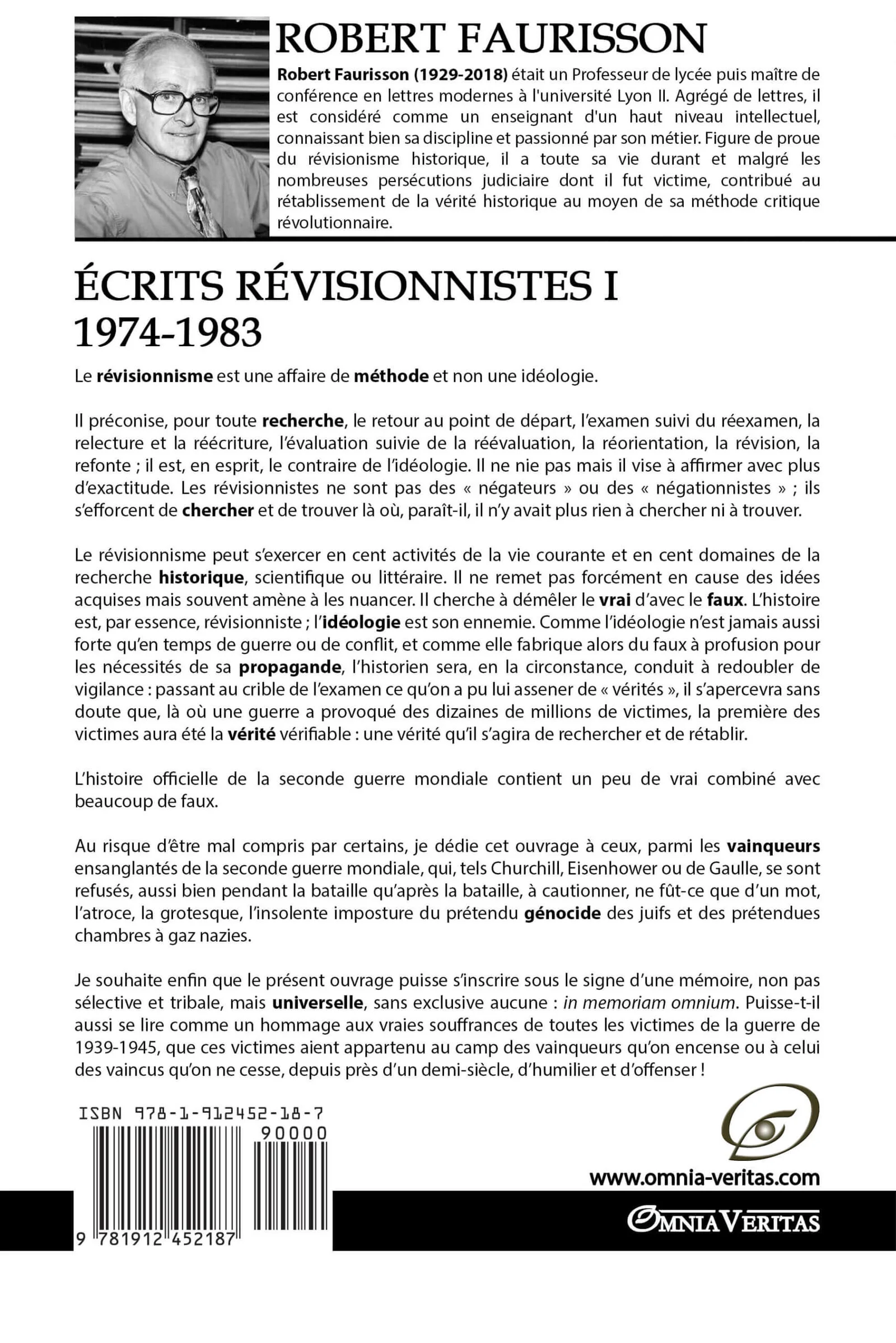 Le révisionnisme peut s’exercer en cent activités de la vie courante et en cent domaines de la recherche historique, scientifique ou littéraire. Il ne remet pas forcément en cause des idées acquises mais souvent amène à les nuancer. Il cherche à démêler le vrai d’avec le faux. L’histoire est, par essence, révisionniste ; l’idéologie est son ennemie. Comme l’idéologie n’est jamais aussi forte qu’en temps de guerre ou de conflit, et comme elle fabrique alors du faux à profusion pour les nécessités de sa propagande, l’historien sera, en la circonstance, conduit à redoubler de vigilance : passant au crible de l’examen ce qu’on a pu lui assener de « vérités », il s’apercevra sans doute que, là où une guerre a provoqué des dizaines de millions de victimes, la première des victimes aura été la vérité vérifiable : une vérité qu’il s’agira de rechercher et de rétablir.
