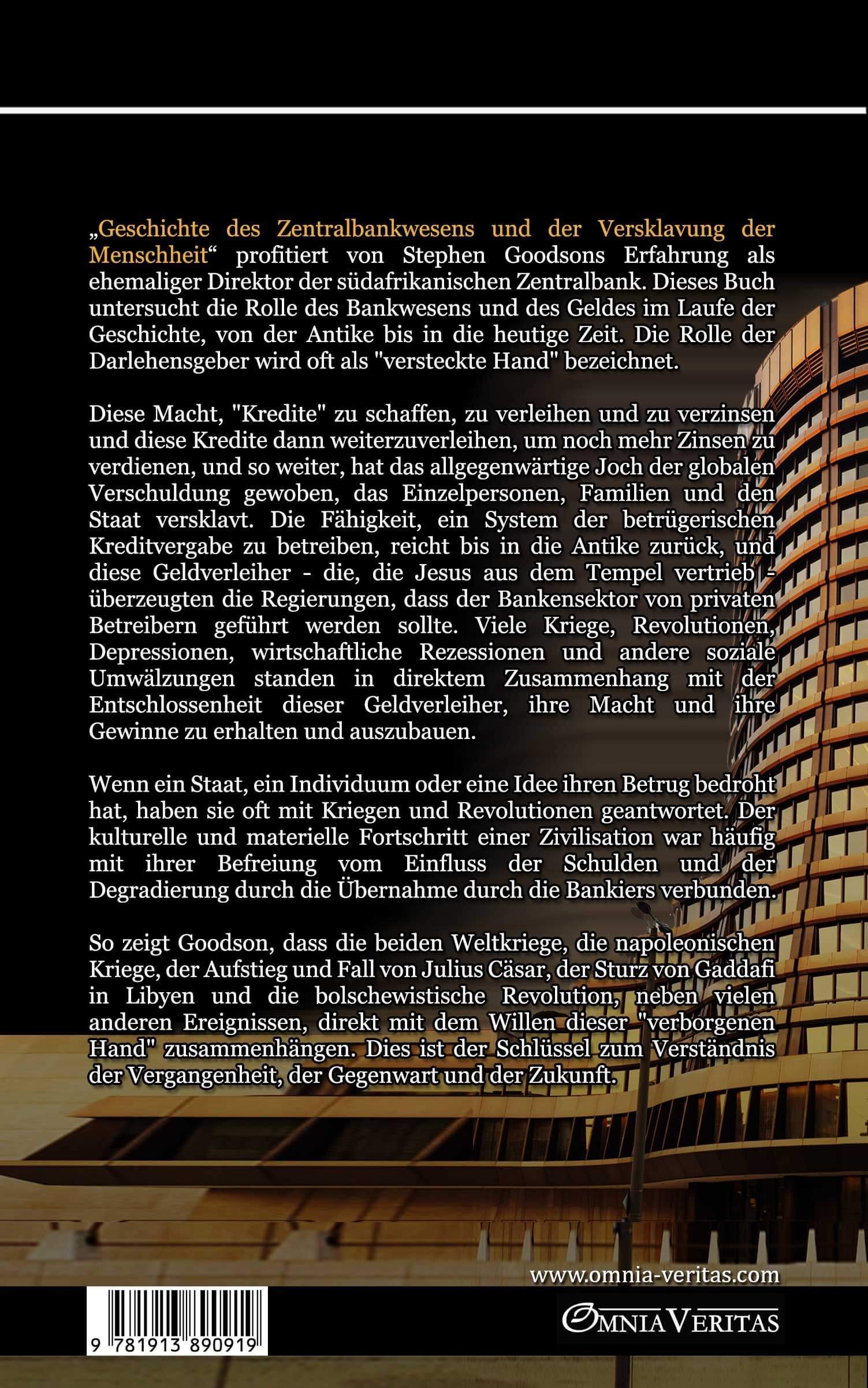 Im Laufe der bekannten Geschichte waren Zeiten, in denen der Staat die Kontrolle über die Geldausgabe ausübte, immer gleichbedeutend mit einer Ära des Wohlstands, des Friedens, der kulturellen Bereicherung, der Vollbeschäftigung und der Null-Inflation. Wenn hingegen Privatbankiers die Kontrolle über die Geldschöpfung an sich reißen, sind die unvermeidlichen Ergebnisse wiederkehrende Zyklen von Armut und Wohlstand, Arbeitslosigkeit, endemische Inflation sowie ein gigantischer und zunehmender Prozess der Übertragung von Reichtum und politischer Macht in die Hände dieser kleinen Clique, die dieses ausbeuterische Geldsystem kontrolliert.