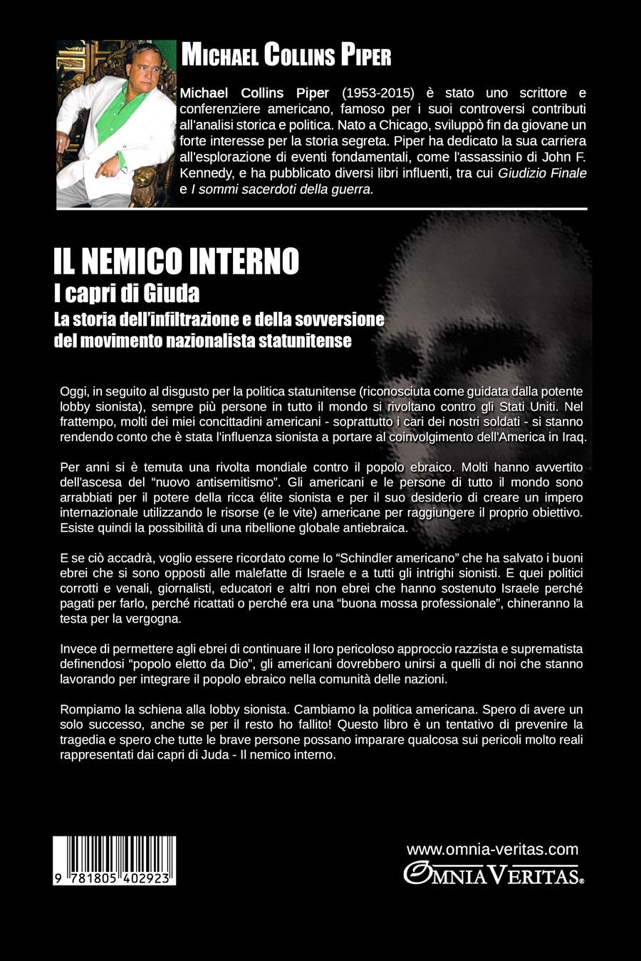 Piuttosto che permettere agli ebrei di continuare il loro pericoloso approccio razzista e suprematista definendosi “popolo eletto da Dio”, gli americani dovrebbero unirsi a quelli di noi che stanno lavorando per integrare il popolo ebraico nella comunità delle nazioni.Rompiamo la schiena alla lobby sionista. Cambiamo la politica americana. Spero di avere un solo successo, anche se per il resto ho fallito! Questo libro è un tentativo di prevenire la tragedia e spero che tutte le brave persone possano imparare qualcosa sui pericoli molto reali presentati da Capre di Giuda – Il nemico interno.