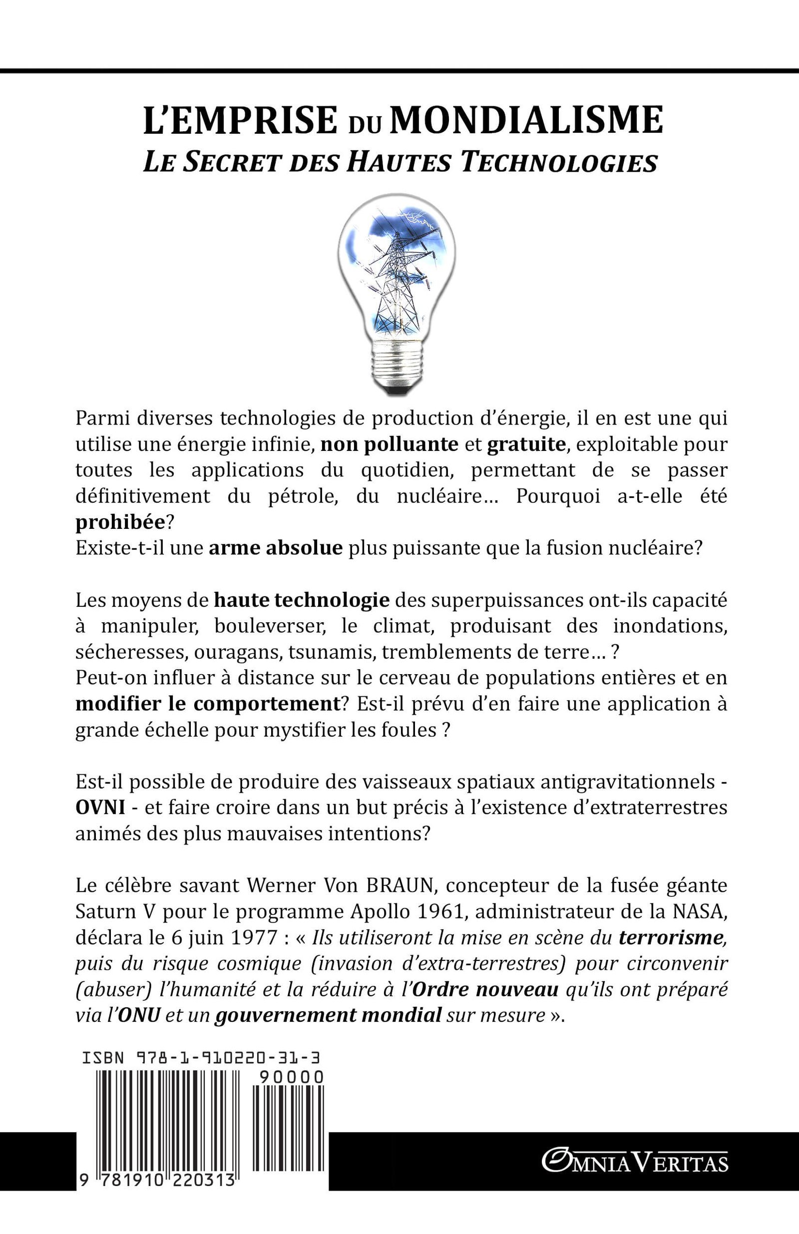 Au fil du temps, ces hautes technologies ont été l’objet de nombreux perfectionnements scientifiques et tactiques réalisés à l’abri de tous regards. Les multiples applications correspondantes civiles et militaires, inimaginables pour le grand public, se rapportent à la manipulation de la pensée, de la volonté. Aux terribles armes de destruction massive, ou sélective. Aux moyens de modifier le temps, de bouleverser le climat en générant à distance des inondations, sécheresses, des ouragans, des tremblements de terre, des tsunamis…