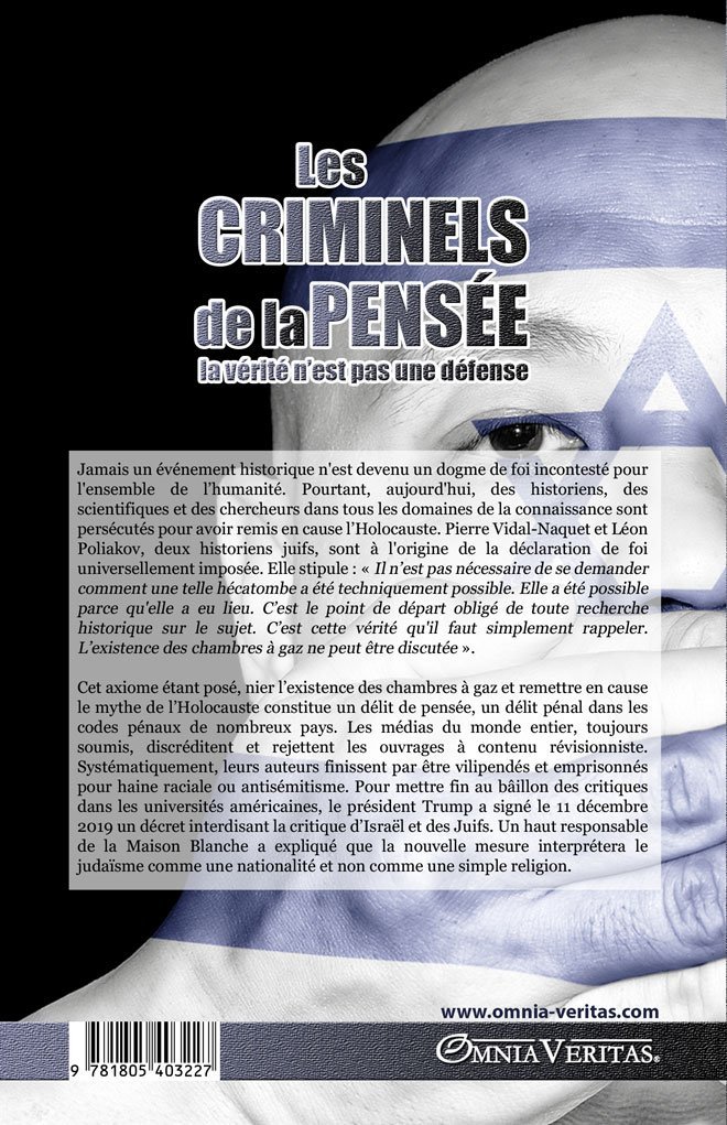 Cet axiome étant posé, nier l’existence des chambres à gaz et remettre en cause le mythe de l’Holocauste constitue un crime de pensée, un délit pénal dans les codes pénaux de nombreux pays. Les médias du monde entier, toujours soumis, discréditent et rejettent les ouvrages à contenu révisionniste. Leurs auteurs sont systématiquement vilipendés et emprisonnés pour haine raciale ou antisémitisme. Pour mettre fin au bâillon imposé aux critiques dans les universités américaines, le 11 décembre 2019, le président Trump a signé un décret interdisant toute critique d’Israël et des Juifs.