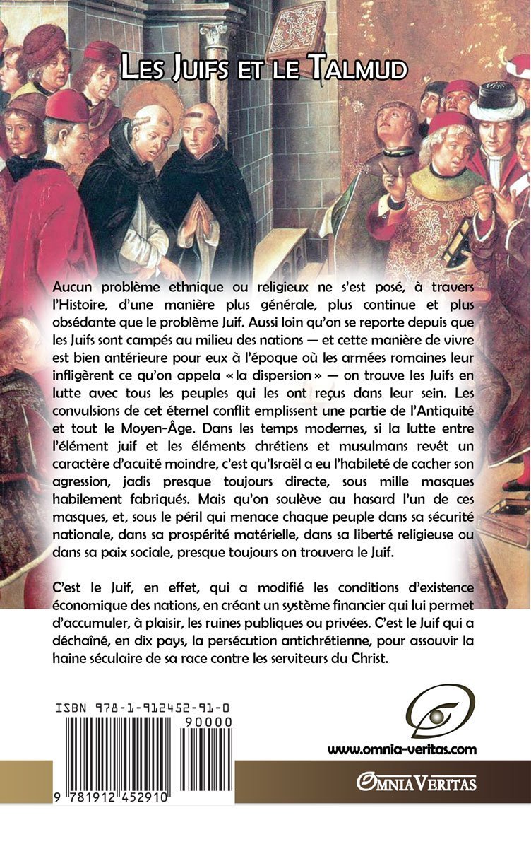 Les convulsions de cet éternel conflit emplissent une partie de l’Antiquité et tout le Moyen-Âge. Dans les temps modernes, si la lutte entre l’élément juif et les éléments chrétiens et musulmans revêt un caractère d’acuité moindre, c’est qu’Israël a eu l’habileté de cacher son agression, jadis presque toujours directe, sous mille masques habilement fabriqués. Mais qu’on soulève au hasard l’un de ces masques, et, sous le péril qui menace chaque peuple dans sa sécurité nationale, dans sa prospérité matérielle, dans sa liberté religieuse ou dans sa paix sociale, presque toujours on trouvera le Juif.