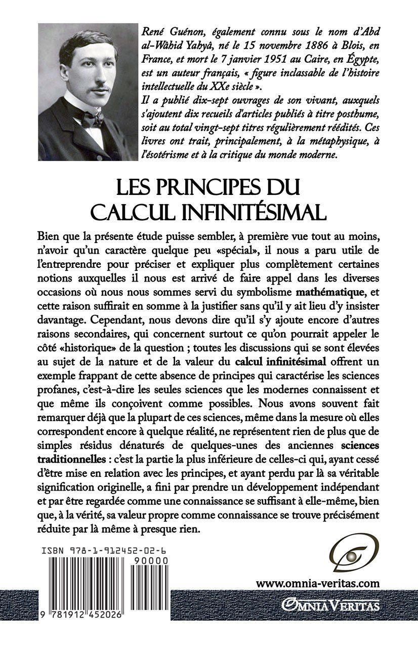 Cependant, nous devons dire qu’il s’y ajoute encore d’autres raisons secondaires, qui concernent surtout ce qu’on pourrait appeler le côté « historique » de la question ; celui-ci, en effet, n’est pas entièrement dépourvu d’intérêt à notre point de vue, en ce sens que toutes les discussions qui se sont élevées au sujet de la nature et de la valeur du calcul infinitésimal offrent un exemple frappant de cette absence de principes qui caractérise les sciences profanes, c’est-à-dire les seules sciences que les modernes connaissent et que même ils conçoivent comme possibles.