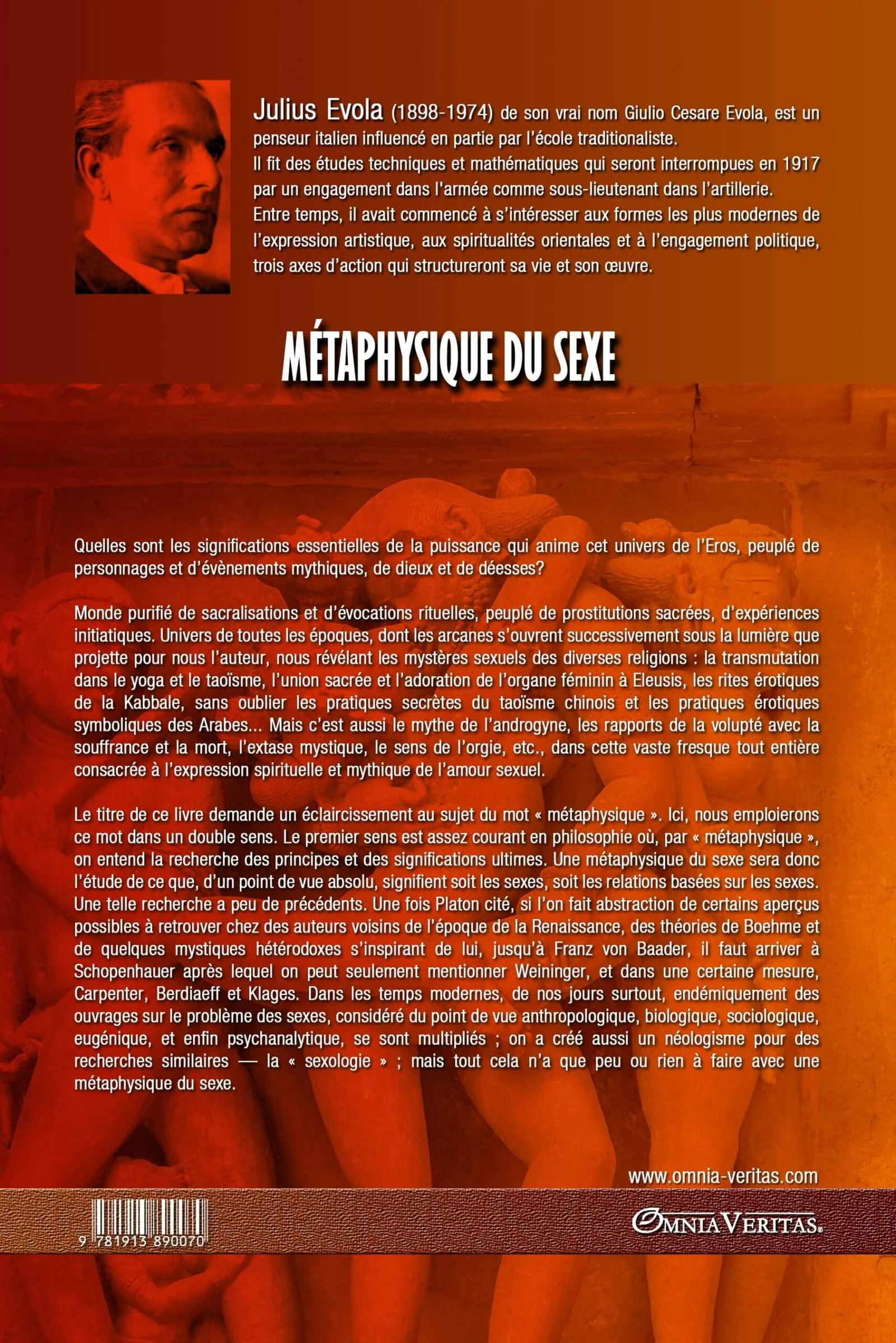Le titre de ce livre demande un éclaircissement au sujet du mot métaphysique . Ici, nous emploierons ce mot dans un double sens. Le premier sens est assez courant en philosophie où, par métaphysique, on entend la recherche des principes et des significations ultimes. Une métaphysique du sexe sera donc l’étude de ce que, d’un point de vue absolu, signifient soit les sexes, soit les relations basées sur les sexes. Une telle recherche a peu de précédents. Une fois Platon cité, si l’on fait abstraction de certains aperçus possibles à retrouver chez des auteurs voisins de l’époque de la Renaissance, des théories de Boehme et de quelques mystiques hétérodoxes s’inspirant de lui, jusqu’à Franz von Baader, il faut arriver à Schopenhauer après lequel on peut seulement mentionner Weininger, et dans une certaine mesure, Carpenter, Berdiaeff et Klages. Dans les temps modernes, de nos jours surtout, endémiquement des ouvrages sur le problème des sexes, considéré du point de vue anthropologique, biologique, sociologique, eugénique, et enfin psychanalytique, se sont multipliés; on a créé aussi un néologisme pour des recherches similaires – la sexologie; mais tout cela n’a que peu ou rien à faire avec une métaphysique du sexe.