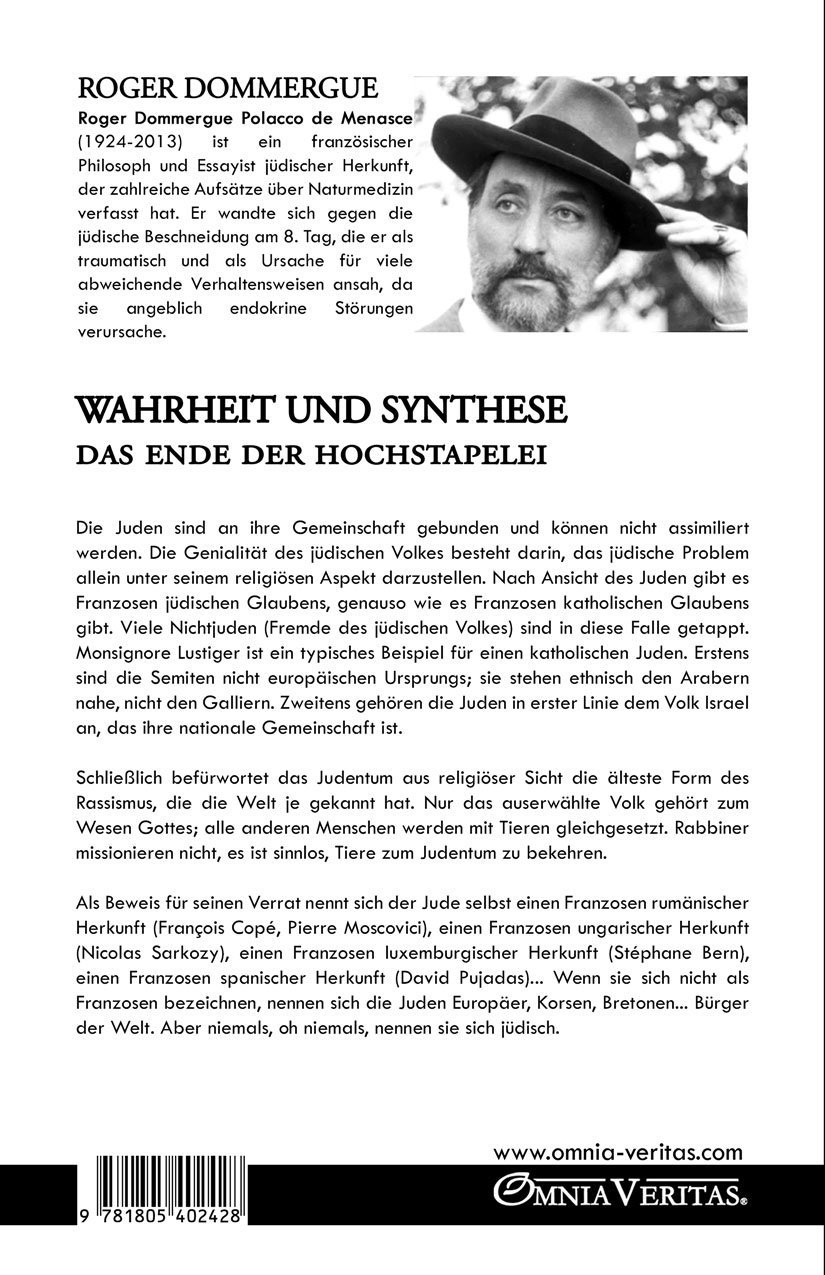 Zunächst einmal sind die Semiten nicht europäischen Ursprungs; sie sind ethnisch den Arabern näher als den Galliern. Zweitens gehören Juden in erster Linie zum Volk Israel, das ihre nationale Gemeinschaft ist. Schließlich befürwortet das Judentum religiös die älteste Form des Rassismus, die die Welt je gekannt hat. Nur das auserwählte Volk gehört zum Wesen Gottes; alle anderen Menschen werden mit Tieren verglichen. Rabbiner betreiben keine Missionierung, es ist sinnlos, Tiere zum Judentum zu bekehren.